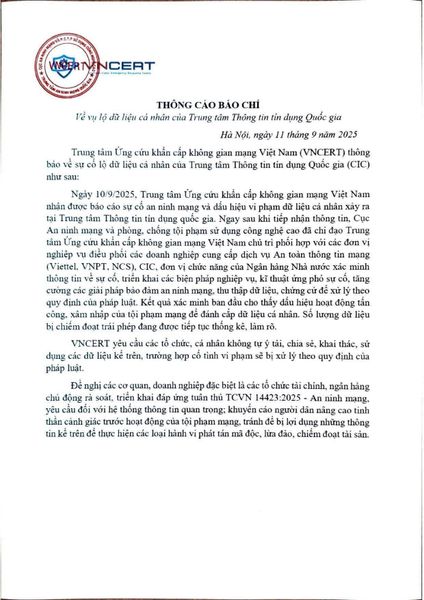 Ngày 11/9/2025, Trung tâm Ứng cứu khẩn cấp không gian mạng Việt Nam (VNCERT) đã phát đi thông cáo báo chí, khẳng định:
