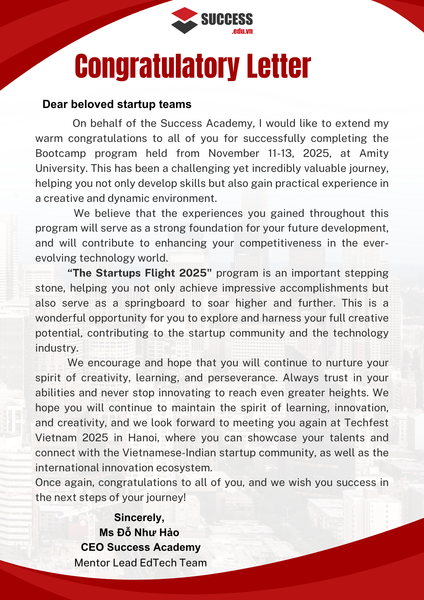 Thay mặt Học viện Thành Công, tôi xin gửi lời chúc mừng nồng nhiệt đến tất cả các bạn đã hoàn thành xuất sắc chương trình Bootcamp ngày 11 - 13/11/2025 tại Đại học Amity. Đây là một hành trình đầy thử thách nhưng cũng vô cùng quý giá, giúp các bạn không chỉ phát triển kỹ năng mà còn tích lũy những kinh nghiệm thực tế trong một môi trường sáng tạo và năng động. Chúng tôi tin rằng những trải nghiệm mà các bạn có được trong suốt khóa học sẽ là nền tảng vững chắc cho sự phát triển của các bạn trong tương lai, đồng thời sẽ góp phần nâng cao năng lực cạnh tranh của các bạn trong thế giới công nghệ đang thay đổi từng ngày.